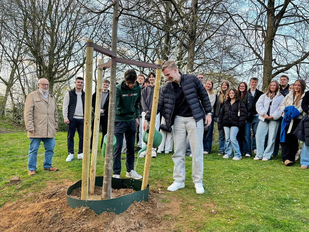 Im Rahmen der Initiative „3333 Bäume für Krefeld“ hat die Abiturientia 2025 des Maria-Sibylla-Merian Gymnasium (MSM) in dankbarer Erinnerung an ihre Schulzeit einen Baum gespendet. Bei dem Baum handelt es sich um eine Winterlinde. Nach der Begrüßung durch den Schulleiter, Oberstudiendirektor Olaf Muti, der traditionsgemäß ein Gedicht zum Thema „Linde“ vortrug, bedankte sich Peter Könen für die Initiative „3333 Bäume für Krefeld“ bei der Abiturientia 2025 für diese großzügige Spende, „mit der wir unserem Ziel, 3333 Bäume in und für Krefeld zu pflanzen, einen Baum näher kommen“. Es sei der Baum Nr. 1809 von 3333 Bäumen, die die Initiative ingesamt pflanzen wolle. Das komme Mensch, Natur und Klima zugute, diene aber auch der Komplettierung des Baumbestandes im Freibereich des MSM. Sein Dank galt auch der Baumschule Büssem-Indenklef, die den Baum beschafft und durch Inhaber Peter Büssem sach- und fachgerecht ins Erdreich gesetzt habe, sowie den Teams des Fachbereichs Umwelt/Verbraucherschutz sowie des Zentralen Gebäudemanagements der Stadt Krefeld, die bei der Festlegung des Pflanzstelle im Frei- und Grünbereich der Schule sowie bei der Auswahl Baumsorte behilflich waren.
