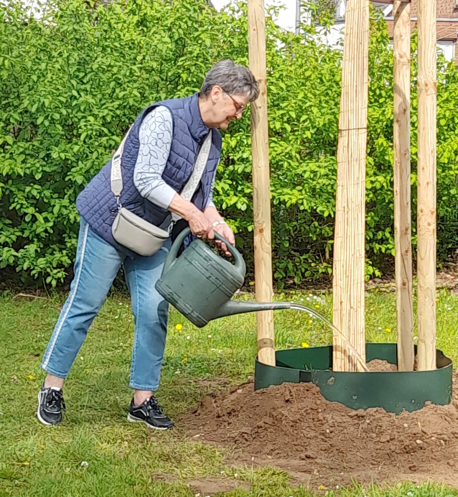 Im Bild: Gisela Pott-Franken beim „Angießen“ der Traubenkirsche, die von ihr gespendet und auf der Fischelner Wiese gepflanzt wurde.