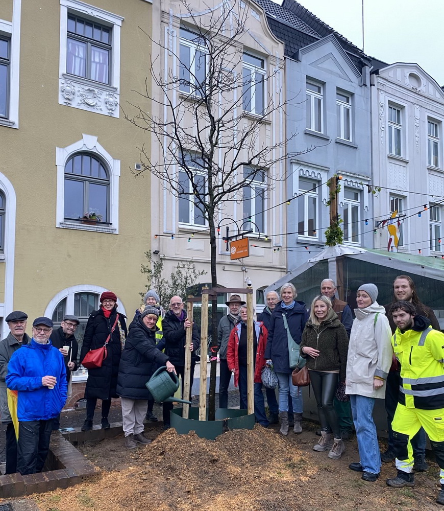 Für die Unterstützung bei der Vorbereitung und Durchführung der Baumpflanzung dankte Renate Krins Alexander Klein vom Kommunalbetrieb Krefeld, „der uns bei der Auswahl des Pflanzstelle und der Baumsorte beraten hat, der Baumschule Büssem-Indenklef und seinem Inhaber Peter Büssem, der den Baum beschafft und mit seinen freundlichen und fleissigen Helfern sach- und fachgerecht ins Erdreich gesetzt hat“.